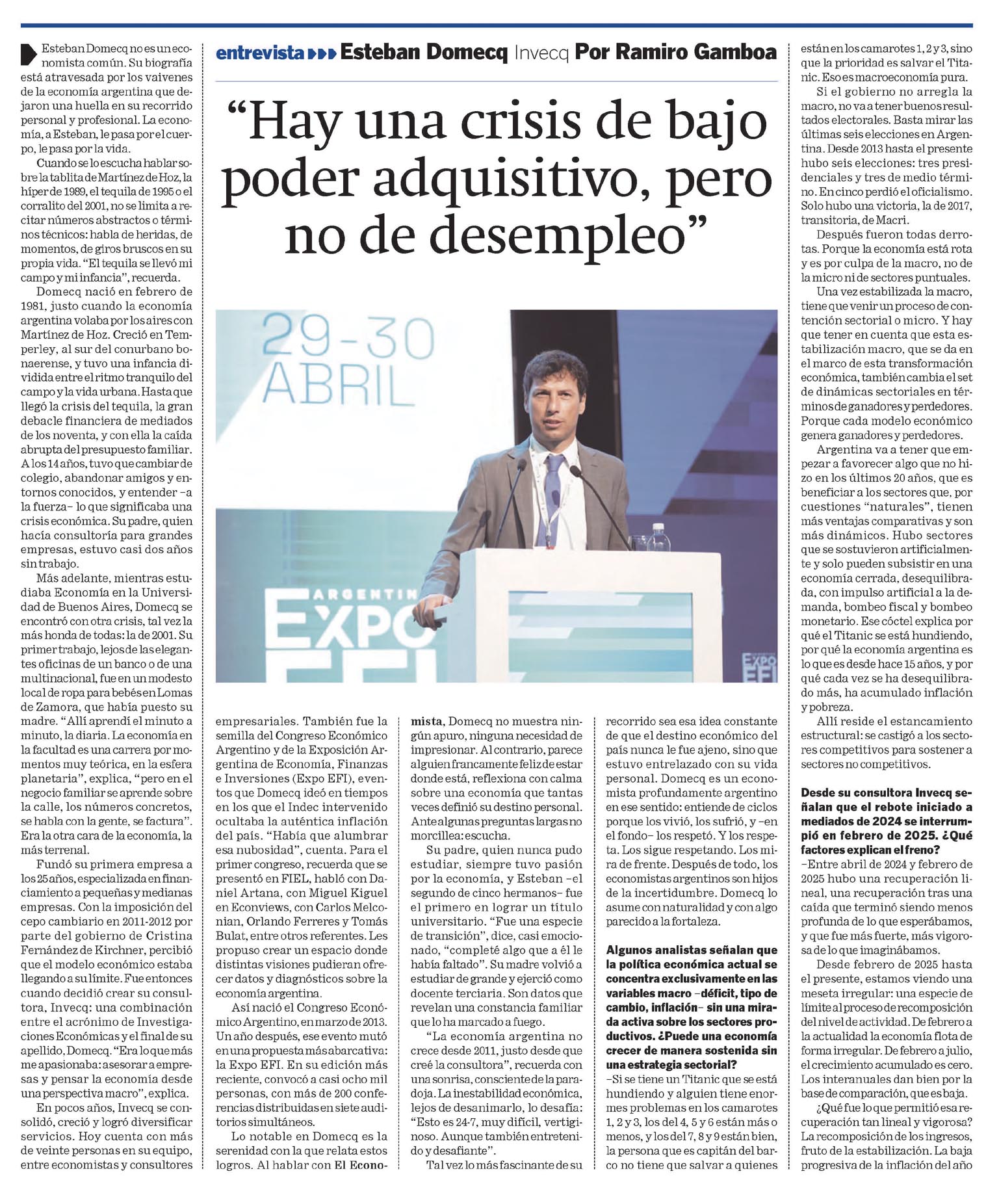 Esteban Domecq no es un economista común. Su biografía está atravesada por los vaivenes de la economía argentina que dejaron una huella en su recorrido personal y profesional. La economía, a Esteban, le pasa por el cuerpo, le pasa por la vida. Cuando se lo escucha hablar sobre la tablita de Martínez de Hoz, la híper de 1989, el tequila de 1995 o el corralito del 2001, no se limita a recitar números abstractos o términos técnicos: habla de heridas, de momentos, de giros bruscos en su propia vida. "El tequila se llevó mi campo y mi infancia", recuerda. Domecq nació en febrero de 1981, justo cuando la economía argentina volaba por los aires con Martínez de Hoz. Creció en Temperley, al sur del conurbano bonaerense, y tuvo una infancia dividida entre el ritmo tranquilo del campo y la vida urbana. Hasta que llegó la crisis del tequila, la gran debacle financiera de mediados de los noventa, y con ella la caída abrupta del presupuesto familiar. A los 14 años, tuvo que cambiar de colegio, abandonar amigos y entornos conocidos, y entender –a la fuerza– lo que significaba una crisis económica. Su padre, quien hacía consultoría para grandes empresas, estuvo casi dos años sin trabajo. Más adelante, mientras estudiaba Economía en la Universidad de Buenos Aires, Domecq se encontró con otra crisis, tal vez la más honda de todas: la de 2001. Su primer trabajo, lejos de las elegantes oficinas de un banco o de una multinacional, fue en un modesto local de ropa para bebés en Lomas de Zamora, que había puesto su madre. "Allí aprendí el minuto a minuto, la diaria. La economía en la facultad es una carrera por momentos muy teórica, en la esfera planetaria", explica, "pero en el negocio familiar se aprende sobre la calle, los números concretos, se habla con la gente, se factura". Era la otra cara de la economía, la más terrenal. Fundó su primera empresa a los 25 años, especializada en financiamiento a pequeñas y medianas empresas. Con la imposición del cepo cambiario en 2011-2012 por parte del gobierno de Cristina Fernández de Kirchner, percibió que el modelo económico estaba llegando a su límite. Fue entonces cuando decidió crear su consultora, Invecq: una combinación entre el acrónimo de Investigaciones Económicas y el final de su apellido, Domecq. "Era lo que más me apasionaba: asesorar a empresas y pensar la economía desde una perspectiva macro", explica. En pocos años, Invecq se consolidó, creció y logró diversificar servicios. Hoy cuenta con más de veinte personas en su equipo, entre economistas y consultores empresariales. También fue la semilla del Congreso Económico Argentino y de la Exposición Argentina de Economía, Finanzas e Inversiones (Expo EFI), eventos que Domecq ideó en tiempos en los que el Indec intervenido ocultaba la auténtica inflación del país. "Había que alumbrar esa nubosidad", cuenta. Para el primer congreso, recuerda que se presentó en FIEL, habló con Daniel Artana, con Miguel Kiguel en Econviews, con Carlos Melconian, Orlando Ferreres y Tomás Bulat, entre otros referentes. Les propuso crear un espacio donde distintas visiones pudieran ofrecer datos y diagnósticos sobre la economía argentina. Así nació el Congreso Económico Argentino, en marzo de 2013. Un año después, ese evento mutó en una propuesta más abarcativa: la Expo EFI. En su edición más reciente, convocó a casi ocho mil personas, con más de 200 conferencias distribuidas en siete auditorios simultáneos. Lo notable en Domecq es la serenidad con la que relata estos logros. Al hablar con El Economista, Domecq no muestra ningún apuro, ninguna necesidad de impresionar. Al contrario, parece alguien francamente feliz de estar donde está, reflexiona con calma sobre una economía que tantas veces definió su destino personal. Ante algunas preguntas largas no morcillea: escucha. Su padre, quien nunca pudo estudiar, siempre tuvo pasión por la economía, y Esteban –el segundo de cinco hermanos– fue el primero en lograr un título universitario. "Fue una especie de transición", dice, casi emocionado, "completé algo que a él le había faltado". Su madre volvió a estudiar de grande y ejerció como docente terciaria. Son datos que revelan una constancia familiar que lo ha marcado a fuego. "La economía argentina no crece desde 2011, justo desde que creé la consultora", recuerda con una sonrisa, consciente de la paradoja. La inestabilidad económica, lejos de desanimarlo, lo desafía: "Esto es 24-7, muy difícil, vertiginoso. Aunque también entretenido y desafiante". Tal vez lo más fascinante de su recorrido sea esa idea constante de que el destino económico del país nunca le fue ajeno, sino que estuvo entrelazado con su vida personal. Domecq es un economista profundamente argentino en ese sentido: entiende de ciclos porque los vivió, los sufrió, y –en el fondo– los respetó. Y los respeta. Los sigue respetando. Los mira de frente. Después de todo, los economistas argentinos son hijos de la incertidumbre. Domecq lo asume con naturalidad y con algo parecido a la fortaleza. Algunos analistas señalan que la política económica actual se concentra exclusivamente en las variables macro –déficit, tipo de cambio, inflación– sin una mirada activa sobre los sectores productivos. ¿Puede una economía crecer de manera sostenida sin una estrategia sectorial? –Si se tiene un Titanic que se está hundiendo y alguien tiene enormes problemas en los camarotes 1, 2 y 3, los del 4, 5 y 6 están más o menos, y los del 7, 8 y 9 están bien, la persona que es capitán del barco no tiene que salvar a quienes están en los camarotes 1, 2 y 3, sino que la prioridad es salvar el Titanic. Eso es macroeconomía pura. Si el gobierno no arregla la macro, no va a tener buenos resultados electorales. Basta mirar las últimas seis elecciones en Argentina. Desde 2013 hasta el presente hubo seis elecciones: tres presidenciales y tres de medio término. En cinc