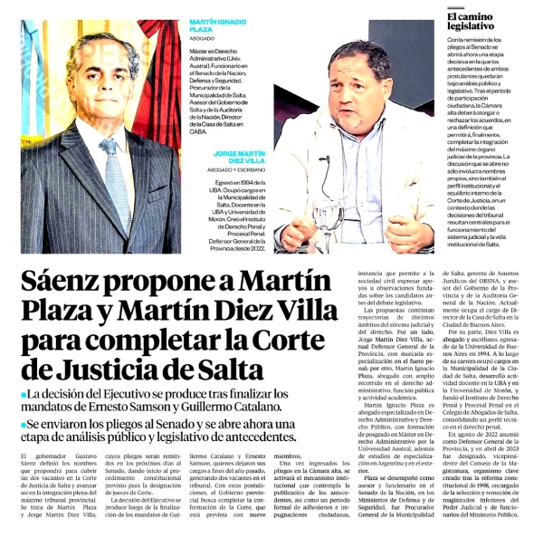MARTÍN IGNACIO PLAZA ABOGADO. Máster en Derecho Administrativo (Univ. Austral). Funcionario en el Senado de la Nación, Defensa y Seguridad. Procurador de la Municipalidad de Salta. Asesor del Gobierno de Salta y de la Auditoría de la Nación. Director de la Casa de Salta en CABA. JORGE MARTÍN DIEZ VILLA ABOGADO Y ESCRIBANO. Egresó en 1994 de la UBA. Ocupó cargos en la Municipalidad de Salta. Docente en la UBA y Universidad de Morón. Creó el Instituto de Derecho Penal y Procesal Penal. Defensor General de la Provincia desde 2022. Sáenz propone a Martín Plaza y Martín Diez Villa para completar la Corte de Justicia de Salta. La decisión del Ejecutivo se produce tras finalizar los mandatos de Ernesto Samson y Guillermo Catalano. Se enviaron los pliegos al Senado y se abre ahora una etapa de análisis público y legislativo de antecedentes. El gobernador Gustavo Sáenz definió los nombres que propondrá para cubrir las dos vacantes en la Corte de Justicia de Salta y avanza así en la integración plena del máximo tribunal provincial. Se trata de Martín Plaza y Jorge Martín Diez Villa, cuyos pliegos serán remitidos en los próximos días al Senado, dando inicio al procedimiento constitucional previsto para la designación de jueces de Corte. La decisión del Ejecutivo se produce luego de la finalización de los mandatos de Guillermo Catalano y Ernesto Samson, quienes dejaron sus cargos a fines del año pasado, generando dos vacantes en el tribunal. Con estas postulaciones, el Gobierno provincial busca completar la conformación de la Corte, que está prevista con nueve miembros. Una vez ingresados los pliegos en la Cámara alta, se activará el mecanismo institucional que contempla la publicación de los antecedentes, así como un período formal de adhesiones e impugnaciones ciudadanas, que permite a la sociedad civil expresar apoyos u observaciones fundadas sobre los candidatos antes del debate legislativo. Las propuestas combinan trayectorias de distintos ámbitos del sistema judicial y el derecho. Por un lado, Jorge Martín Diez Villa, actual Defensor General de la Provincia, con marcada especialización en el fuero penal; por otro, Martín Ignacio Plaza, abogado con amplio recorrido en el derecho administrativo, función pública y actividad académica. Martín Ignacio Plaza es abogado especializado en Derecho Administrativo y Derecho Público, con formación de posgrado en Máster en Derecho Administrativo por la Universidad Austral, además de estudios de especialización en Argentina y en el exterior. Plaza se desempeñó como asesor y funcionario en el Senado de la Nación, en los Ministerios de Defensa y de Seguridad, fue Procurador General de la Municipalidad de Salta, gerente de Asuntos Jurídicos del ORSNA, y asesor del Gobierno de la Provincia y de la Auditoría General de la Nación. Actualmente ocupa el cargo de Director de la Casa de Salta en la Ciudad de Buenos Aires. Por su parte, Diez Villa es abogado y escribano, egresado de la Universidad de Buenos Aires en 1994. A lo largo de su carrera ocupó cargos en la Municipalidad de la Ciudad de Salta, desarrolló actividad docente en la UBA y en la Universidad de Morón, y fundó el Instituto de Derecho Penal y Procesal Penal en el Colegio de Abogados de Salta, consolidando un perfil técnico en el derecho penal. En agosto de 2022 asumió como Defensor General de la Provincia, y en abril de 2023 fue designado vicepresidente del Consejo de la Magistratura, organismo clave creado tras la reforma constitucional de 1998, encargado de la selección y remoción de magistrados inferiores del Poder Judicial y de funcionarios del Ministerio Público. El camino legislativo Con la remisión de los pliegos al Senado se abrirá ahora una etapa decisiva en la que los antecedentes de ambos postulantes quedarán bajo análisis público y legislativo. Tras el período de participación ciudadana, la Cámara alta deberá otorgar o rechazar los acuerdos, en una definición que permitirá, finalmente, completar la integración del máximo órgano judicial de la provincia. La discusión que se abre no sólo involucra nombres propios, sino también el perfil institucional y el equilibrio interno de la Corte de Justicia, en un contexto donde las decisiones del tribunal resultan centrales para el funcionamiento del sistema judicial y la vida institucional de Salta.